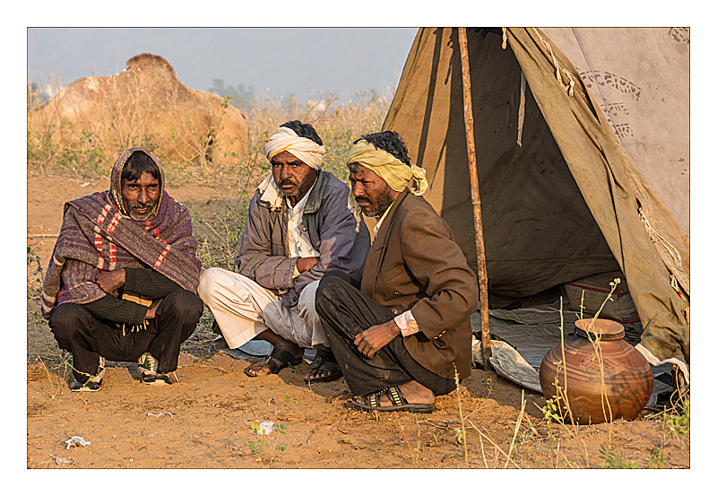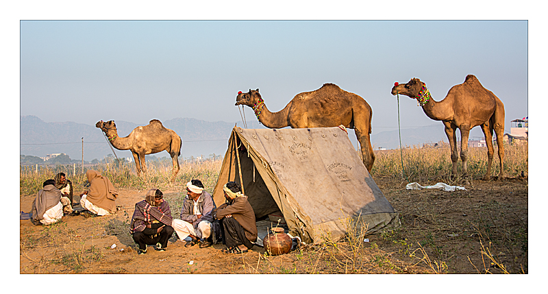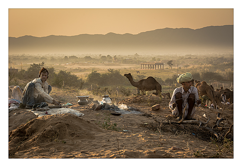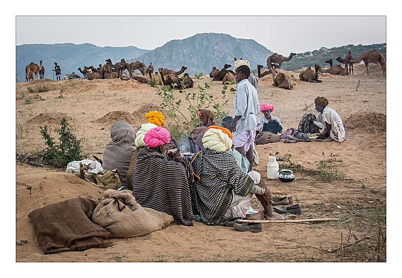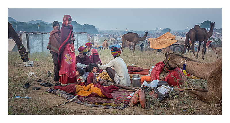 Pushkar Camel Fair - early morning families having breakfast