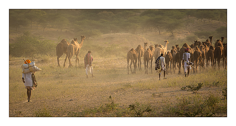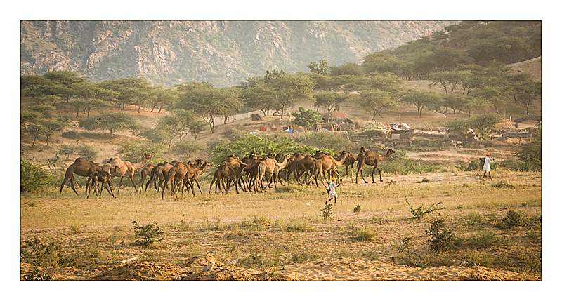 Evening at the Pushkar Camel Fair - they tie the leg up so they can't run away