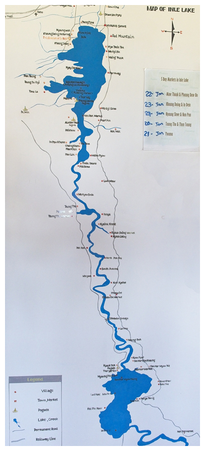 15 The Map of Inle Lake - The First Two Days we Stay at the Top Lake and its Many Tributaries. Our Hotel is the Pristine Lotus Spa Resort